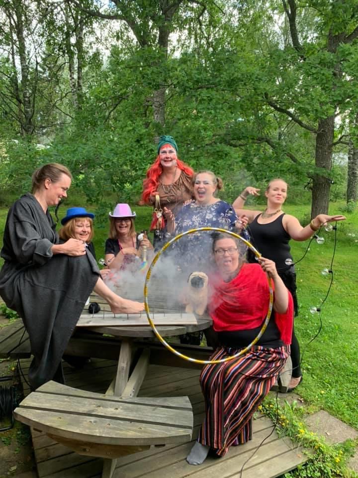 Live-roolipelikirjoittamistakin on tullut jonkin verran harrastettua – tosin varsin löysin rantein. Muokkasin nimittäin loppukesän humoristisessa illanvietossa aikuisille vetämäni sirkusmaailmalarpin nuorten lyhyeksi kevytversioksi teatteri-ilmaisun kurssin opiskelijoilleni. Oli ihanaa, kun opiskelijat heittäytyivät mukaani leikkimään yhdellä aamutunnilla! Hahmot vaihtelivat turvamiehestä ja metrilakun myyjästä taikureihin, käärmeidenlumoojiin ja yksisarvisten kouluttajaan. Taiteen tekemisen edellytysten pohdiskelun sijasta tässä kevytversiossa keskityttiin ideoimaan sirkusseurueelle erilaisia tulevaisuudenmahdollisuuksia. Ja samalla harjoiteltiin tietysti roolissa pysymistä.