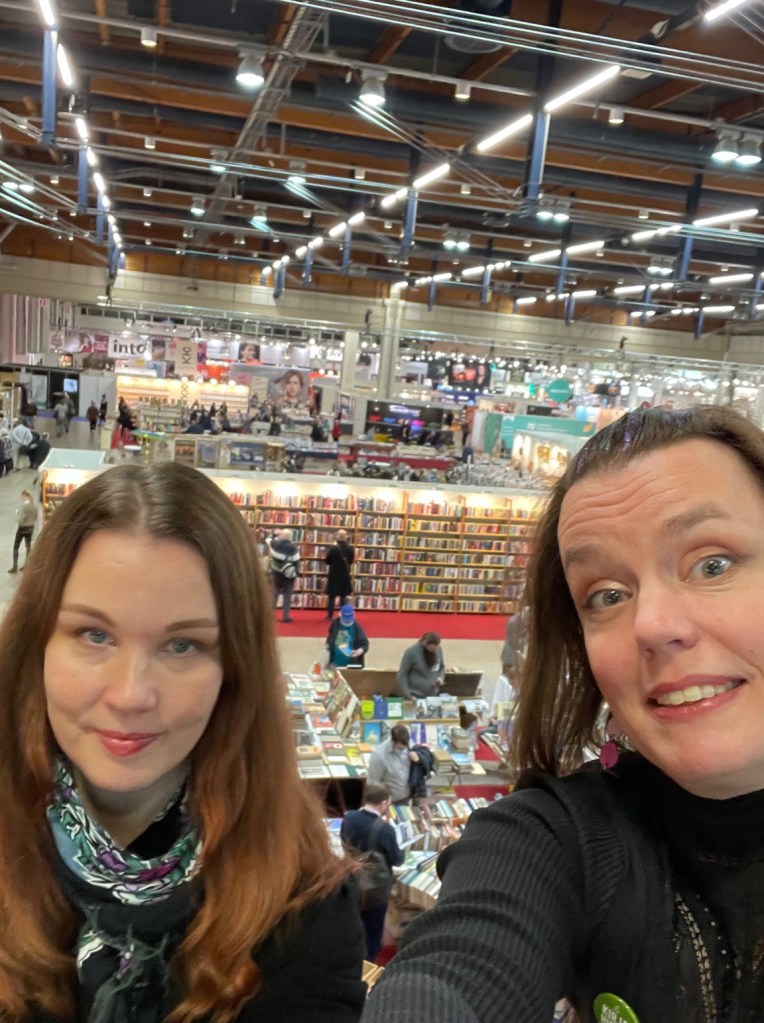 Kirjallisen ohjelman lisäksi keskityin mielipuolisen intoilevana markkinointiin: kävin höyryämässä sekä Osuuskumman pöydän ääressä että Enostone Kustannuksen osastolla, jossa esittelimme Pulmu Kailamon kanssa ensi vuonna julkaistavaa yhteisromaaniamme ja yritimme epätoivoisesti keksiä sille nimeä, sillä työnimet – joita niitäkin on ollut monia – eivät enää tunnu tarpeeksi teosta kuvaavilta.