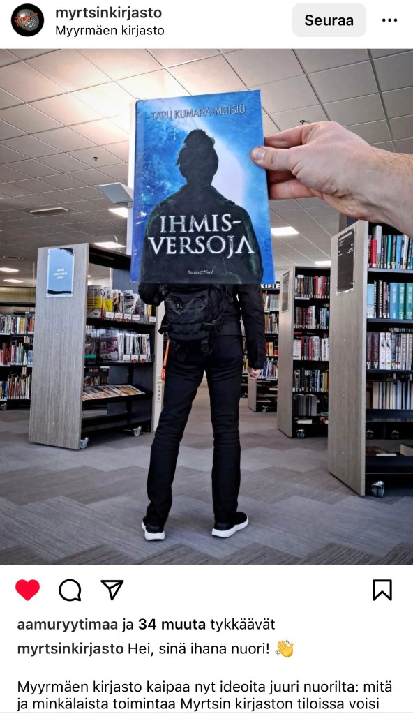 Loppuun hassu bookface-kuva Taivaanjuurien sisarteoksesta Ihmisversoista: se on vanha, löytyi yllätyksenä Instagramista, mutta ilahduttaa edelleen – kiitos Myrtsin kirjasto!