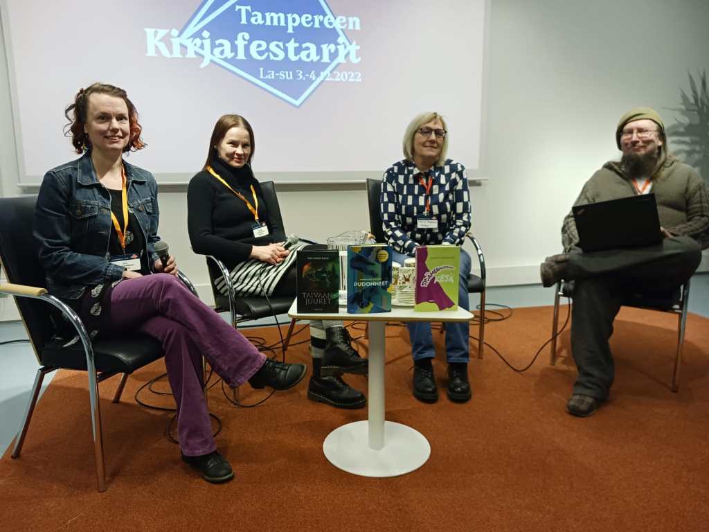 Loppuun muisto Tampereen Kirjafestareilla kuullusta, Pirkkalaiskirjailijoiden tuottamasta “Elämää suuremmat teemat nuortenkirjallisuudessa” -paneelikeskustelusta (kuvan otti Asko Jaakonaho, vieressäni istuvat Marisha Rasi-Koskinen, Katariina Romppainen ja paneelia vetänyt Harri István Mäki), jossa pohdimme sitä, kuinka lasten, nuorten ja aikuisten kirjallisuudessa ei lopulta ole kovin suurta eroa, ihmisyyden teemat ovat pitkälti samoja.