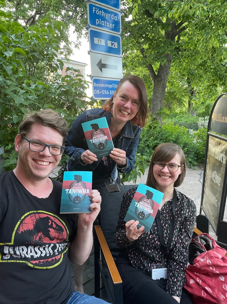 Parasta Euroconissa olivat Konflikt-teemaan liittyvien ajankohtaisten puheenvuorojen lisäksi kaikki kohtaamiset, niin tuttujen fantasiakirjallisuuden ystävien kuin uusien tuttavuuksienkin (mm. Tanskasta, Hollannista, Islannista!) kesken. Oli helppo löytää yhteistä puhuttavaa. Saimme myös yhtenä iltana juhlistettua My Finnish Taniwhaa, mikä oli hauskaa. Osuuskumma painatti teoksesta juuri paperiversioita, aiemminhan Taniwha-romaanini englanninkielisestä käännöksestä (kääntäjä Christina Saarinen) oli saatavilla vain e-kirjaversio. Julkaisuista vielä lisäsananen: jaoimme Euroconissa tuoretta Pretty Weird -lehteä, joka esittelee kuuden kotimaisen spefikirjailijan tuotantoa englanniksi. Oli huippua päästä julkaisuun mukaan kirjailijaesittelyn sekä My Finnish Taniwhan näyteluvun kautta.