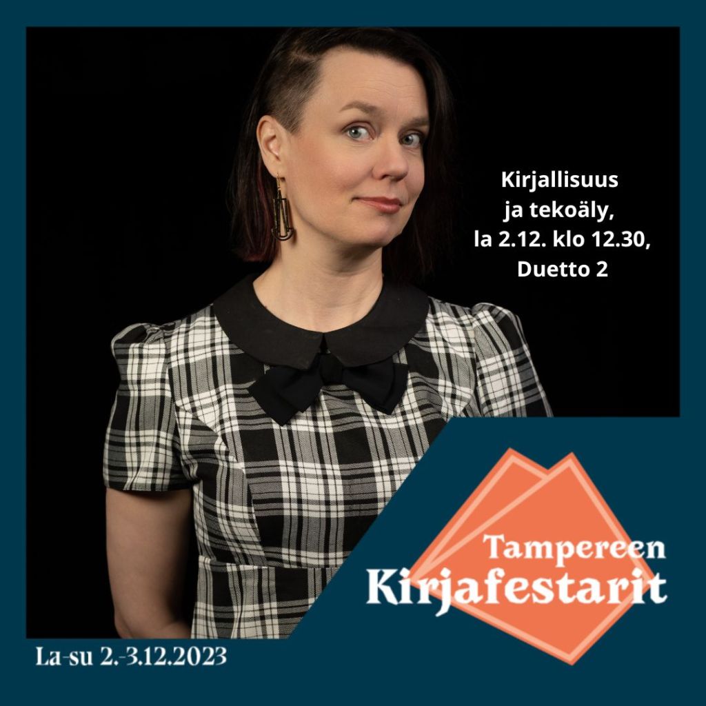 Olen lauantaina Tampereen Kirjafestareilla mukana Osuuskumman järjestämässä Kirjallisuus ja tekoäly -paneelissa yhdessä Carita Forsgrenin ja Reetta Vuokko-Syrjäsen kanssa. Keskustelua vetää Saara Henriksson. Pohdimme, ovatko tekoälysovellukset uhka vai mahdollisuus kirjallisuudelle ja laajemmin taiteelle. Entä mitä tekoälyiltä voi odottaa tulevaisuudessa? Tervetuloa kuulolle!