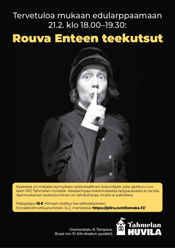 Historiallinen edularppini Rouva Enteen teekutsut (jossa eläydytään Tahmelan huvilan miljööseen vuonna 1912) toteutuu 21.2. Tervetuloa paikan päälle matalalla kynnyksellä, mukaan voi ilmoittautua huvilan nettilomakkeen kautta. Haastattelin muuten tammikuun alussa Tahmelan huvilalla Soriseva harju -podcastiin näytelmäkirjailija, ohjaaja ja taiteen akateemikko Sirkku Peltolaa. Kannattaa kuunnella, mitä yhdessä pohdiskelimme näytelmien kirjoittamisesta ja ohjaamisesta sekä millaisia elämännäkemyksiä Sirkku Peltola kantaa sydämessään.
