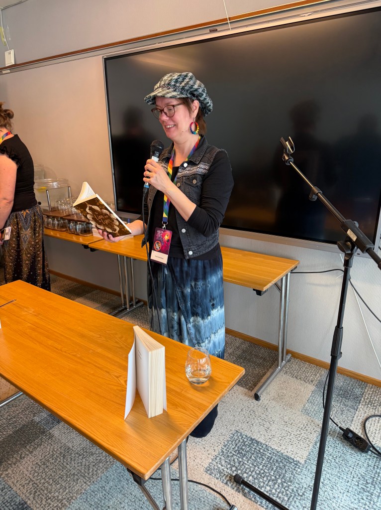 Kuvamuisto #1: Fantasia- ja scifikirjallisuustapahtuma Archipelaconissa (Maarianhaminassa mainiot järjestelyt kaikkine työpajoineen ja paneeleineen!) vietettiin Osuuskumman tuoreen novelliantologian The Lion and the Lynx julkkareita, ja pääsimme kukin paikalla ollut kirjailija lukemaan yleisölle näytteitä novelleistamme. Oman scifinovellini My Dear House on kääntänyt englanniksi Christina Saarinen. Novellini on alun perin julkaistu suomeksi nimellä Umpu Osuuskumman Ei aivan ihmisiä -novelliantologiassa 2021. Osuuskumman sivuilla antologiasta lisää: