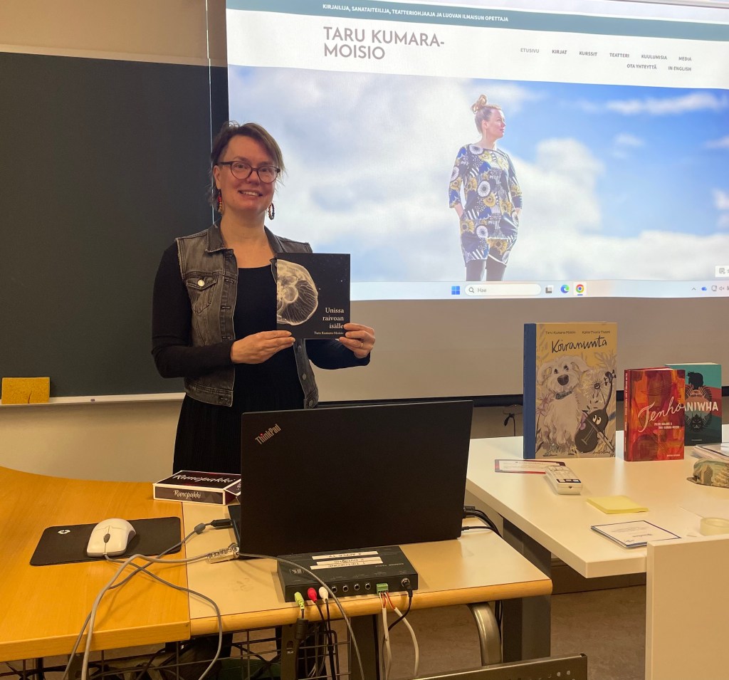 Kävin esittelemässä teosta juuri ennen julkkareita myös lukiolaisille Tampereen yhteiskoulun lukion kirjailijavieraana. Vierailun maksoi Suomen lasten- ja nuortenkirjailijat ry, kiitos mahdollisuudesta päästä esittelemään tuoretta teosta! Runokokoelmani sopii hyvin myös nuorten käsiin, sillä monessa runossa näkökulma on lapsen tai nuoren ja keskiössä ovat vanhempien ja lasten väliset suhteet. Runoissa iloitaan ja surraan, kaivataan ja pelätään, riemuitaan ystävyydestä ja tutkitaan omia kipupisteitä yhdessä muiden kanssa. Tarkoitukseni on tehdä kouluvierailuja runokokoelman siivin lisääkin ensi vuoden puolella.